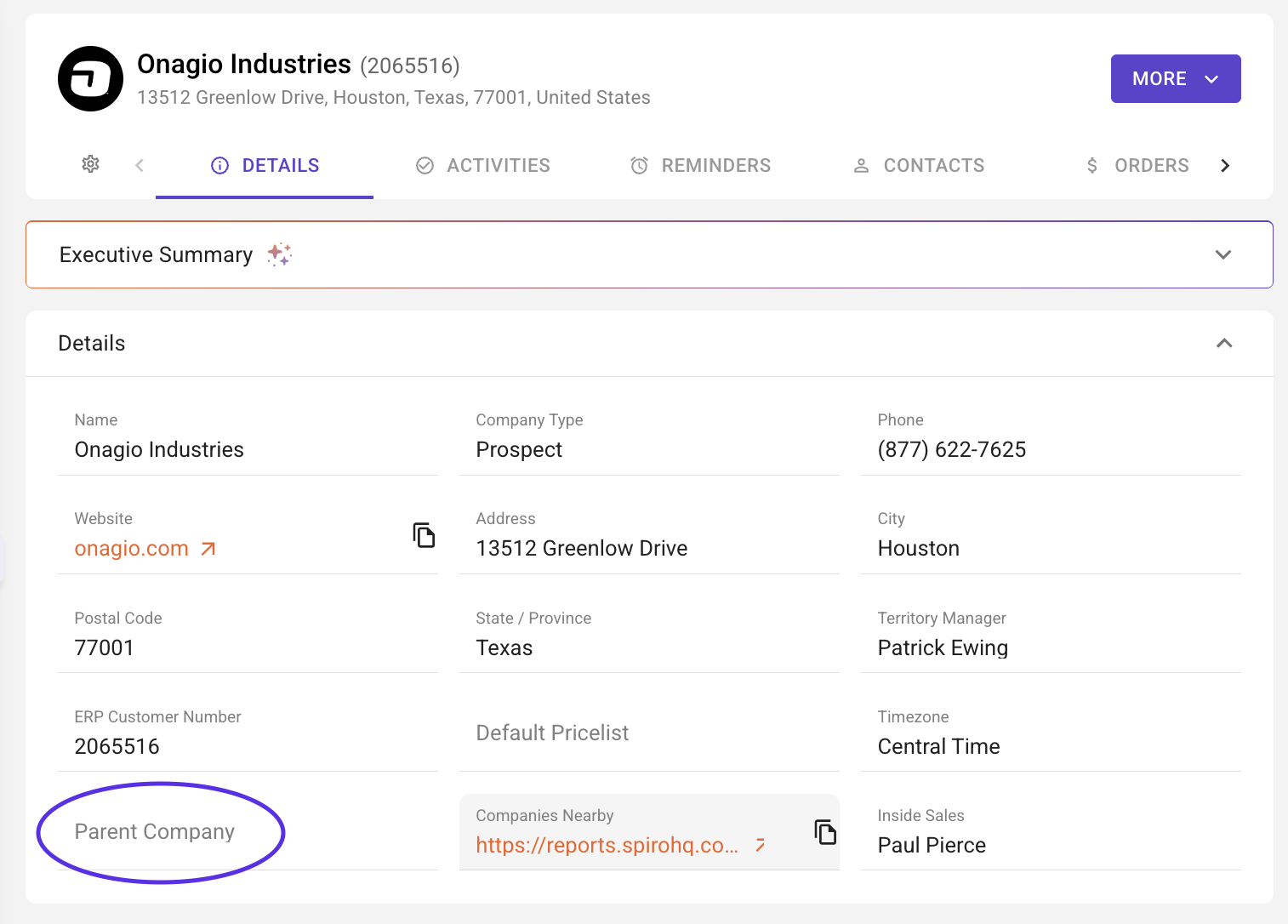 First, go to a company record in Spiro for which you would like to set a parent company. Once Parent/Child is enabled for your organization, you should be able to see a field labeled Parent Company. The Parent Company field acts as a lookup field for Companies that already exist in Spiro that you want to relate to another company. After you have selected the parent company, click out of the field to save. In this example, we chose to set Spiro as the parent company.