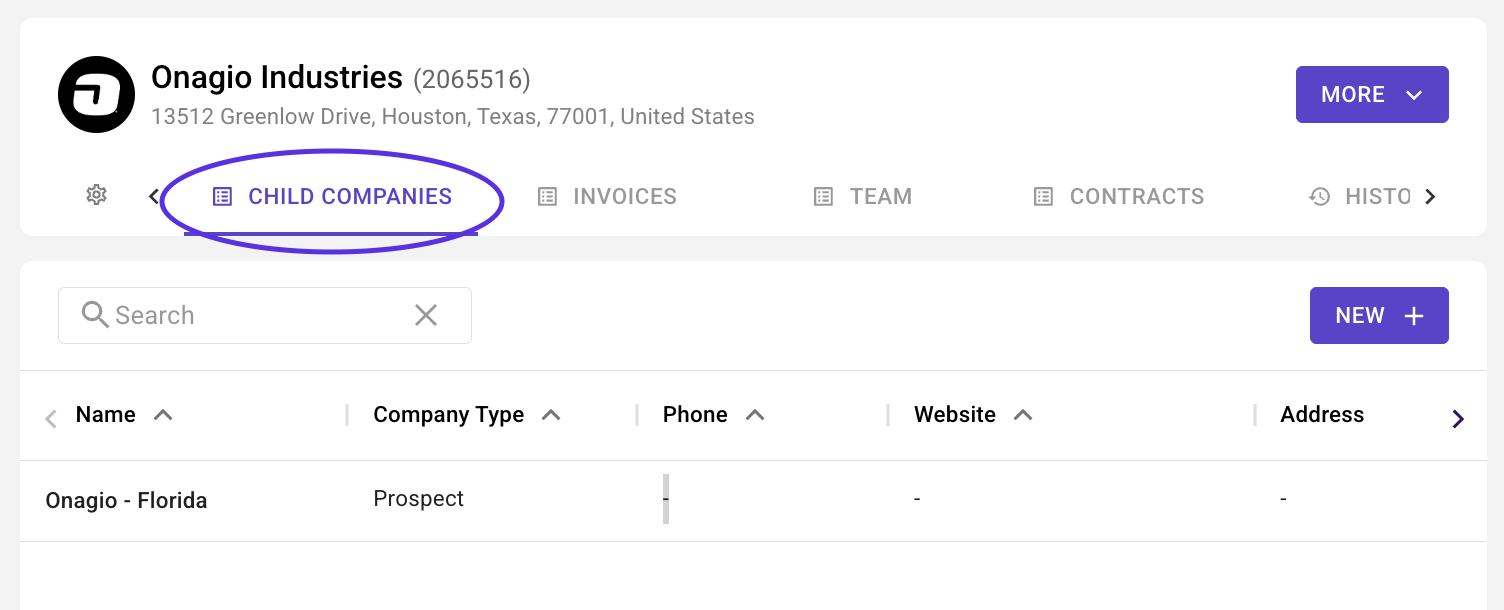 Now that you have set up your first parent/child relationship, you can click on the link to the parent company from the child company page. On the parent page, there will be a section at the top toolbar showing all the associated child companies (there can be multiple). In addition, the activities, collaboration notes and other items from the child companies (Contacts, Opportunities, etc.) will be visible on the parent company record.