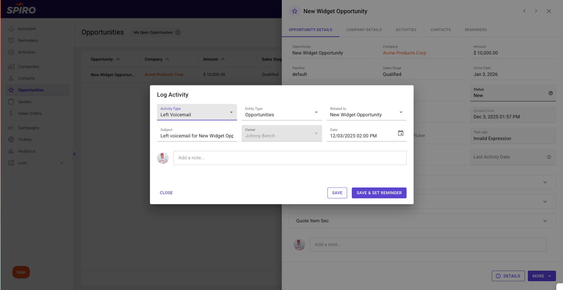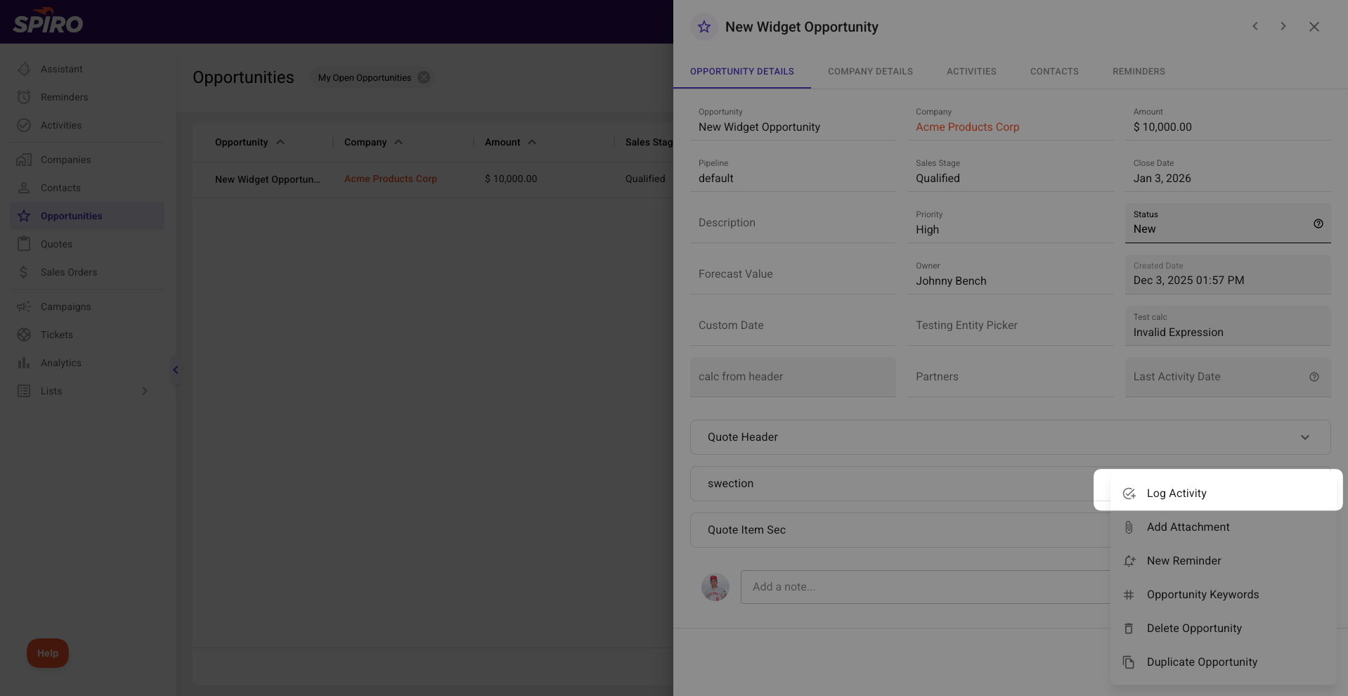 You can log activities directly from any list view—Opportunities, Contacts, or Companies.