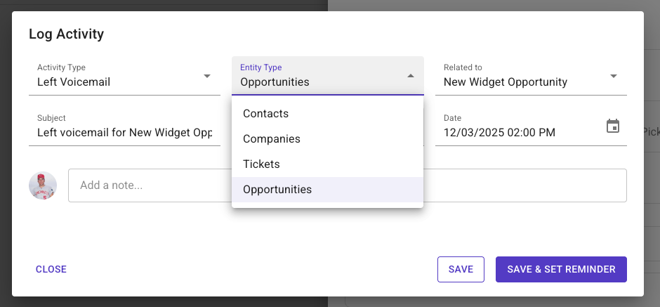 If you started in the wrong place - no worries! You can change your mind with our flexible activity modal. If you started on a company and realize you want to log an activity to a contact, just change the Entity Type field to Contact