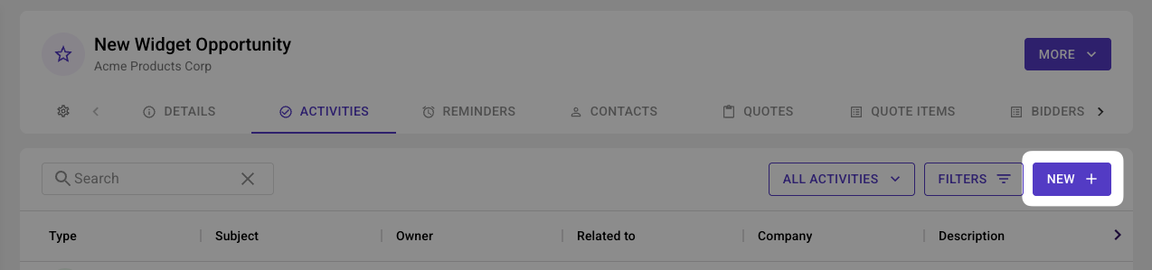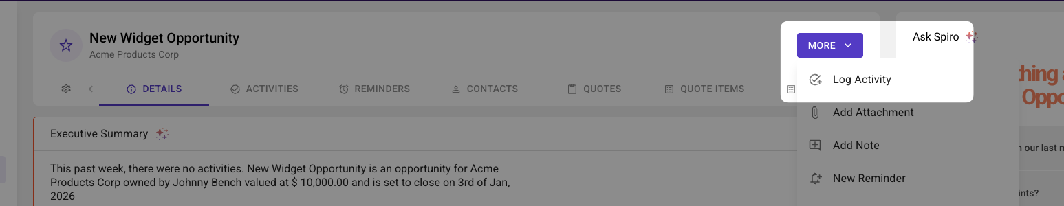 Spiro automatically captures activities such as emails, calendar events, calls, texts, video meetings and more. All the activities captured in Spiro will populate under Activities on a company, contact or opportunity record, which is a history of all past interactions. You have the option to filter activities, search for a specific activity or log new activities on a company, contact or opportunity record. You can also add notes and attachments by using the "More" button at the top of each record.